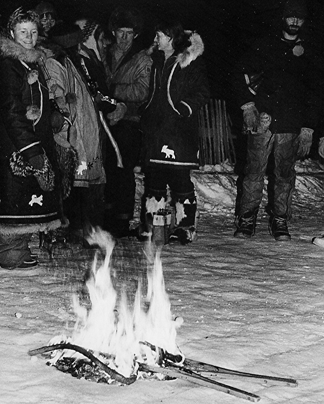Finish line of the '86 Quest at Whitehorse--retirement party--opened the wine--burned the snowshoes--sold the team--bought a sailboat.