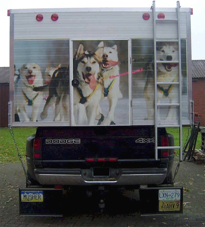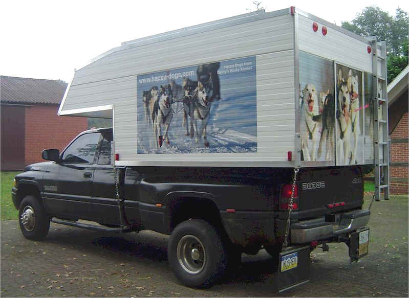 dually, heavy duty chassis, 5.9l Cummins diesel Room for up to 40 dogs and "sleeping-room" for the musher. We have a passive ventilation, means two portholes in the roof and one very small door at the end of the truck bed, ventilation only by air-circulation from the back of the truck to the roof. Additionally (for the autumn or warmer winters) one electrical fan under the roof and one heater/cooler in the truck bed. Box skin is made of special isolation-material, 4cm thick, best isolation. Never saw that before. The graphics are prints from high quality. A photographer made these for me over the last two years during Europe's long-distance-races in Norway. |