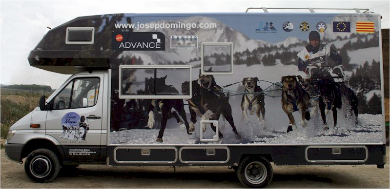 Josep Domingo Beltran Truck Barcelona, Spain, winner of the 2006 PIRENA race Photo & info provided by Helmut Dietz Mercedes Benz truck has boxes for 40 dogs and is equipped with anything you can imagine. The truck is almost 300 horsepower strong and is a four wheel drive of course. It doesn't look big, but it is a truck with lot of space. |