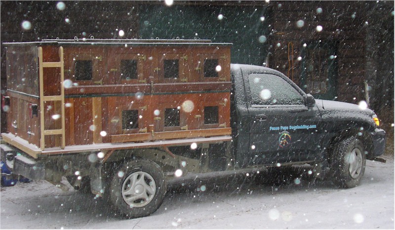 Daryl & Dori Hollingsworth's New Truck Seward, Alaska 2006 Toyota Tundra Half Ton 4 X 4 Crew Cab We extended the bumper a foot for extra storage space in the rear. There is peg board separating the dogs for socialization and air movement. We've added air springs for better weight distribution. It's trimmed with diamond plate and metal edges. There is a nice overhang to keep the rain out of the boxes. The truck is extremely comfortable to drive & ride in even with a load of dogs. With the crew cab we have room to take our grandson & his mother to the races. |