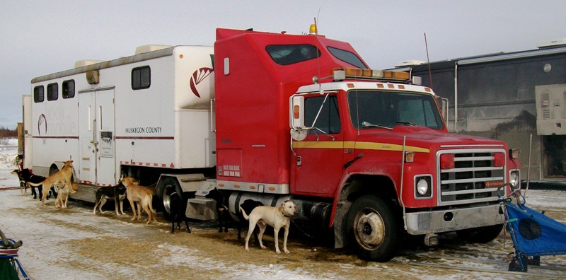 Cris & Randy DeKuiper, Hesperia, Michigan The first year with the "DeKuiper Bookmobile-Dog Truck Rig" has drawn a lot of attention - even the 2010 ONAC announcer in Fairbanks kept mentioning "truck envy" on the part of other dog drivers!! The trailer has 32 dog boxes, with lots of storage, an LP furnace, 3 cylinder diesel generator (which means microwave and electric can opener!!) and living quarters - no hot water yet!! The truck is a 1988 International/360 diesel motor - we got 10-12 mpg on the way to Quebec from Michigan (but not from Michigan to Alaska through the mountains!!) |
