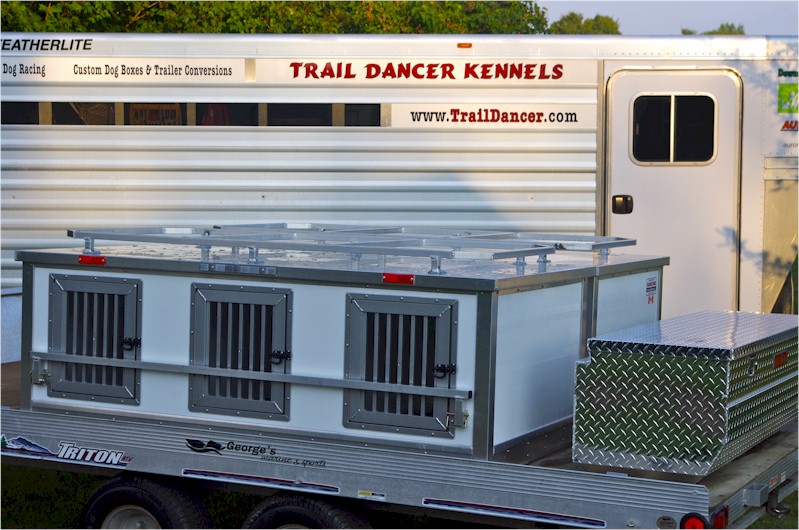 A pair of matching 3-hole dog boxes for my trailer manufactured by Gavin Baker (Trail Dancer Kennels). The construction is superb. The trailer provides room for my ATV up front for fall training or for supplies in the winter. The boxes stack for other uses (the roof racks keep them together securely, as they tuck into the floor frame). Aluminum frame, aluminum coated mahogany plywood walls, and all aluminum roof, make for a long-lasting, weather-tight box. It's the box I've wanted for 20 years. It was worth the wait! More photos on my Facebook page. |