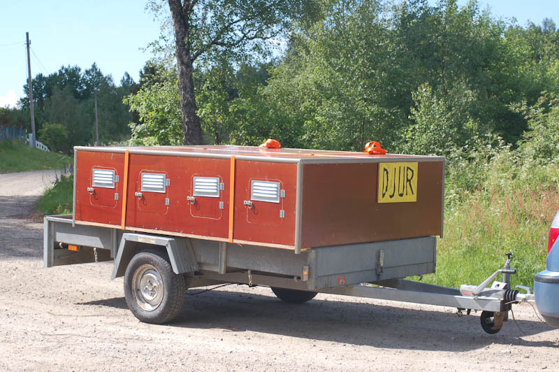 This is a picture of my first dog box trailer setup for the SDC truck photos page. I say "first", as I'm already planning the next one after having made all the newbie mistakes on this one. The dogs are safe inside though. 8 boxes, MDO sides and roof, 2x2" inner frame, 1/2" plywood floor.