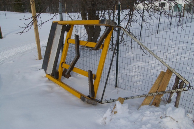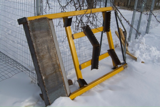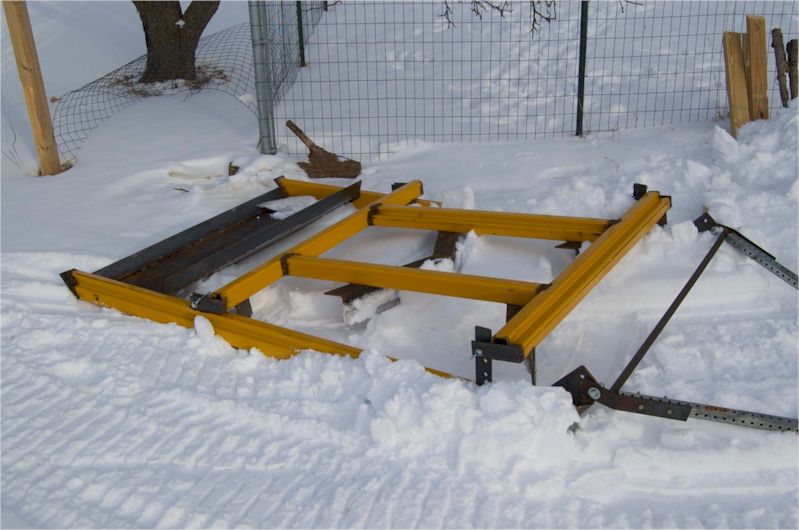 The yellow frame is salvaged from a dismantled industrial racking system. Cutters are steel angle with cutting plates bolted to them. It is about 4.5 feet wide and almost 7 feet long (excluding the tongue). Works well, but its best to let the snow settle or run over it once with a machine before trying to pull it through fresh deep snow. Requires some weight on the front end of the snowmobile to get around tight corners, but you can back it up. Might be nice to put a snow comb under the compaction plate in the back, but it tracks well without it. Mike S. [back to Trail Groomers Index]