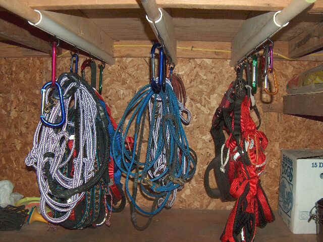 stacks of harnesses and ropes that tangle endlessly?) We are long on shelf space but short on wall space at our house. So to alleviate some of the lack of hanging space for equipment, I came up with a quick and easy pull out hanger designed to go under a shelf. Our space is 3' 4" deep so I purchased a 10' section of 1¼" Schedule 40 PVC water line. This is nice and heavy for the job. Cut this to the desired length and used the table saw to cut a slot down the middle stopping 7" from the end of the pipe. I next drilled 4 screw holes opposite the slot to fasten the pipe to the underneath side of the shelf. We counter sank the screw heads. Next I purchased an 1¼" 4' dowel rod for the pull out part. This slides into the PVC pipe easily. I used 1¼" rubber coated cup hooks to insert into the dowel rod and evenly space intervals with the first one against the back of the slot on the PVC pipe. (NOTE here skip the rubber on the cup hooks just buy plain ones.) Drill pilot holes for the cup hooks. Don't cut the dowel rods off to the length of the PVC pipe, leave the ends stick out for handles. We hang harnesses, ganglines, extra collars, that kind of equipment on ours. I purchased some large carabiners at Harbor Freight so I could bunch the collars and harnesses up to hang more on the hooks. Submitted October 2007