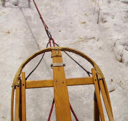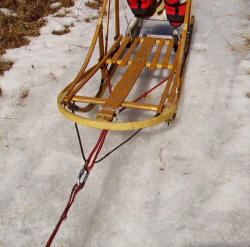 Bridles I have different kinds of sleds (both wooden and Hi Tec) and for a long time I have looked at what makes different sleds handle the way they do, especially the sprint and some of the mid-distance sleds. So for all who feel that they need to find a better handling sled I’d offer this to you to try first. This has worked for me on both types of sleds. I use a bridle that combines the traditional bridle and some of what the distance sleds use. I use a standard bridle setup that goes around the back and side stanchions and goes up to the middle of the sled but with a loop that is 6 inches ahead of the brush bow. This is where all of the pull comes from. I then add another line that goes around the front outside corners of the sled (where the front crosspiece attaches to the runners) and thru the loop of the bridle. Make this line with just a little slack in it. You are now pulling from where most of the weight is centered (at the back of the sled) and being steered from the front outside corners. Pull from the back and steer from the front. Also I don’t use any bungee in this bridle. I believe you will surprised in the sled's overall handling and ability to go around corners because now instead of trying to crank that short wheelbase sled, the sled is now following where the dogs are going. Mounting QCR Rail If you have a sled with wooden runners you might want to try, or at least discuss with sled builders and other mushers, what I found that makes sliding plastic on the QCR system real easy. If you look at the top (the side that screws onto the runner) of the QCR rail you will find that it’s around ½ inch wide, so if you have a 1½ in wide runner take a router and make a cut ½ in wide on each side of the bottom of the runner and no more than 1/64th of an inch deep, or a little less if you want. What this does is equals the depth of space and takes away the variances between the QCR and runner. Now you can screw the QCR down tight and slide the plastic on and off with ease. This gives you the ability to race with the best Hi Tec plastic available and change it back to training plastic whenever you want, without resorting to caveman tools. Provided by Steve Bergemann, December 2009