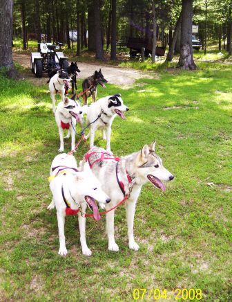 We tried it out today for the first time - our 4th of July "parade." The temps were in the high 40s. I went ahead on a motorized quad to keep the team down to 10 mph. just in case the brakes didn't hold them back enough. They hadn't been hooked up to run since last March so I figured that they would be rarin' to go too fast. Rick says it handles like the "Escalade" of rigs. Provided by Linda Lange, Michigan, 7/7/08