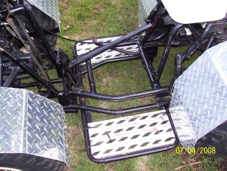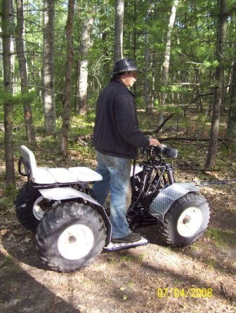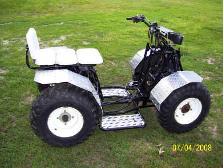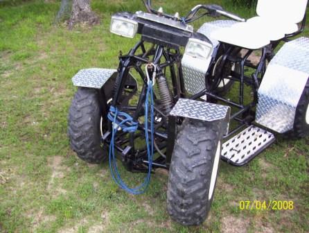 Our new Quad Rig features a standing platform with a double/reinforced frame, sitting option for driver and a passenger; locking digger brake and all quad brakes working; headlights and fenders turn with the wheels. The original quad is a Kawasaki Bayou 300.