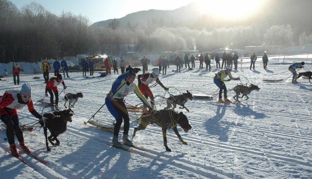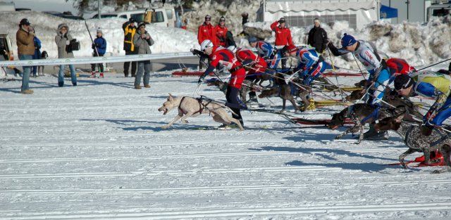 The " Combine " is the combination of two 6Km. races (Pulk and Skijoring) one after the other done by the same skier with the same dog! The change is done in the Race Start and Arrival Area. It is very spectacular indeed because the skiers with their dogs start in a Mass Start.